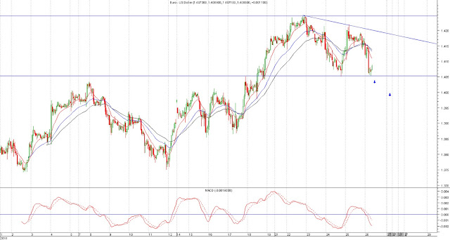 I got short EUR just below 1.42 in line with my trading plan: http://swingtradersedge.blogspot.com/2011/03/usd-big-picture-double-bottom-trade.html. This has worked well initially and we saw quite a sharp fall on Friday night. As per the chart below, we need to break 1.40/1.4050 to see increased momentum to the downside. I know that a strong USD and Equity market do not go hand in hand but I have always found it more profitable to trade the setup first and then react according to the underlying price action rather than trying to over think. EUR has topped nicely and trended down in line with my double top pattern despite equities continuing their strong run. Anything can happen. Something will give at some point but keep following the price.